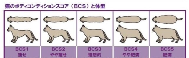 ワンちゃんや猫ちゃんの適正体重を評価するための指標で、「痩せすぎ」、「適正」、「肥満体型」を見た目と触診で